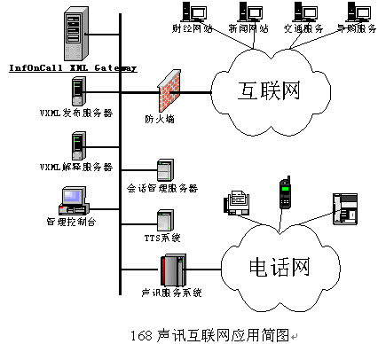 穎科VoiceXML技術(shù)成功應用于遼寧電信168聲訊互聯(lián)網(wǎng)系統(tǒng),也是VoiceXML技術(shù)在國內(nèi)首次成功實現(xiàn)電信級應用。在原有的聲訊平臺上,通過新添加的穎科VXML系統(tǒng),可以充分利用VoiceXML的優(yōu)勢,實現(xiàn)增值業(yè)務快速得開發(fā)、部署、和更改,借助IXG工具,能夠快速得開發(fā)出互聯(lián)網(wǎng)聲訊業(yè)務。