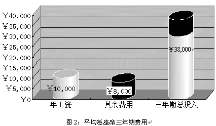 就中國目前的經(jīng)濟(jì)水平而言,一個座席人員年收入(包括工資、獎金、福利等等)大約為¥10,000,而每個座席人員所配備的軟硬件設(shè)施合計約為¥5,000;據(jù)專業(yè)機構(gòu)統(tǒng)計,中國的座席人員平均穩(wěn)定的工作年限為三年,而在這三年為了保證座席人員能夠準(zhǔn)確、高效的實現(xiàn)對用戶提供專業(yè)服務(wù),所投入的培訓(xùn)費用大約為¥3,000。所以在三年期間為每個座席的平均花費為¥38,000。