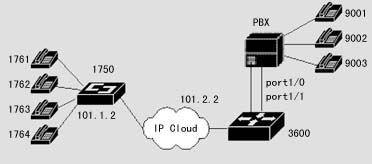 在該案例中,分部辦公室放置IP地址為10.1.1.2的DCR 1750路由器(插有二塊兩端口的FXS語(yǔ)音卡),總部辦公室放置IP地址為10.1.2.2的DCR 3660路由器(插有一塊兩端口的FXO語(yǔ)音卡),通過(guò)正確的規(guī)劃和配置可以實(shí)現(xiàn)銷售部辦公室和總部辦公室之間的IP語(yǔ)音連接。DCR 3660路由器是到達(dá)總部辦公室的主網(wǎng)點(diǎn),它需要連接到公司的PBX上,當(dāng)然,在分布也可以直接使用FXO語(yǔ)音卡和PBX直接連接,這樣在分部與總部之間可以通過(guò)IP網(wǎng)絡(luò)來(lái)?yè)艽?話費(fèi)的長(zhǎng)途電話。