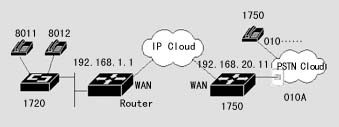 在該案例中,異地之間通過(guò)兩臺(tái)DCR 1750互連,并提供語(yǔ)音模塊,可直接接電話機(jī),使得異地之間可以通過(guò)IP網(wǎng)絡(luò)撥打IP語(yǔ)音電話。