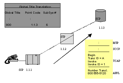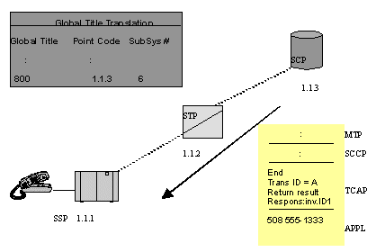 主叫用戶(hù)拔叫800用戶(hù)號(hào),這就觸發(fā)位于交換局(圖中SSP)內(nèi)的路由應(yīng)用程序發(fā)出一個(gè)TCAP查詢(xún)。圖中的STP收到查詢(xún),用MTP層和SCCP層協(xié)議轉(zhuǎn)發(fā)查詢(xún)到SCP的800號(hào)碼數(shù)據(jù)庫(kù)。這樣,SSP中的應(yīng)用程序就和SCP直接建立了對(duì)話(huà)。