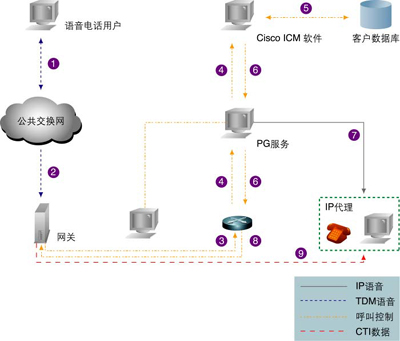 CallManager。(4)Cisco CallManager通過(guò)ICM PG把該路由申請(qǐng)送到ICM。(5)ICM檢查客戶(hù)的賬號(hào)信息,并通過(guò)對(duì)賬號(hào)信息的分析確定路由。(6)ICM調(diào)用一個(gè)客戶(hù)定義的路由腳本,以便選擇最合適的IPCC代理受理客戶(hù)的請(qǐng)求,并通過(guò)外設(shè)網(wǎng)關(guān)(PG)轉(zhuǎn)給目標(biāo)CCM。(7)PG發(fā)送客戶(hù)信息數(shù)據(jù)到目標(biāo)IPCC代理的桌面(在屏幕上彈出信息框)。(8)CCM指示VoIP網(wǎng)關(guān)連接客戶(hù)和目標(biāo)代理。(9)VoIP網(wǎng)關(guān)建立語(yǔ)音連接。