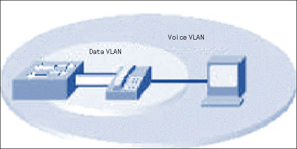 由于QoS、可擴展性、可管理性和安全性等原因,IP電話設備和IP數(shù)據(jù)設備應該部署在兩個邏輯上獨立的網(wǎng)段中。將IP語音與傳統(tǒng)IP數(shù)據(jù)網(wǎng)分離能大大提高抗攻擊能力,而且允許使用相同的接入層、核心層和分布層。