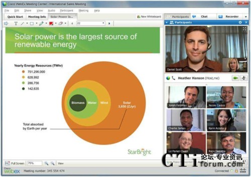 隨著支持高質(zhì)量視頻的思科WebEx™ Meeting Center的推出,與會者將能夠在全屏視頻模式下非常清晰的看到其他與會人員,從而使網(wǎng)絡會議變成一個虛擬視頻會議室。除了能夠通過高清晰度的全屏顯示看到發(fā)言者外,用戶還能同時共享桌面,并通過思科的 WebEx One Touch輕松接入思科網(wǎng)真會議。思科WebEx還提供ActivePresence功能,可沿屏幕底部以條狀顯示所有與會者。當前的發(fā)言者以全屏顯示,并保持與參會者之間的視頻交互。借助語音激活轉(zhuǎn)換功能,當另一個與會者開始發(fā)言時,他將被轉(zhuǎn)為全屏顯示狀態(tài)。思科網(wǎng)真終端也支持ActivePresence功能。