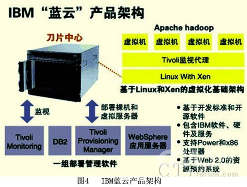 通過IBM的技術(shù)白皮書,我們可以一窺藍(lán)云計(jì)算平臺(tái)的內(nèi)部構(gòu)造!八{(lán)云”建立在IBM大規(guī)模計(jì)算領(lǐng)域的專業(yè)技術(shù)基礎(chǔ)上,基于由IBM軟件、系統(tǒng)技術(shù)和服務(wù)支持的開放標(biāo)準(zhǔn)和開源軟件。簡(jiǎn)單地說,“藍(lán)云”基于IBM Almaden研究中心(Almaden Research Center)的云基礎(chǔ)架構(gòu),包括Xen和PowerVM虛擬化、Linux操作系統(tǒng)映像以及Hadoop文件系統(tǒng)與并行構(gòu)建!八{(lán)云”由IBM Tivoli軟件支持,通過管理服務(wù)器來(lái)確保基于需求的最佳性能。這包括通過能夠跨越多服務(wù)器實(shí)時(shí)分配資源的軟件,為客戶帶來(lái)一種無(wú)縫體驗(yàn),加速性能并確保在最苛刻環(huán)境下的穩(wěn)定性。IBM新近發(fā)布的“藍(lán)云(Blue Cloud)”計(jì)劃,能夠幫助用戶進(jìn)行云計(jì)算環(huán)境的搭建。它通過將Tivoli、DB2、WebSphere與硬件產(chǎn)品(目前是x86刀片服務(wù)器)集成,能夠?yàn)槠髽I(yè)架設(shè)一個(gè)分布式、可全球訪問的資源結(jié)構(gòu)。根據(jù)IBM的計(jì)劃,首款支持Power和x86處理器刀片服務(wù)器系統(tǒng)的“藍(lán)云”產(chǎn)品將于2008年正式推出,并且計(jì)劃隨后推出基于System z“大型主機(jī)”的云環(huán)境,以及基于高密度機(jī)架集群的云環(huán)境。