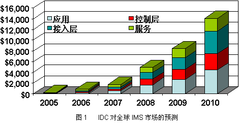 IMS作為一個通信架構(gòu),開創(chuàng)了全新的電信商業(yè)模式,拓展了整個信息產(chǎn)業(yè)的市場空間。IMS正在成為新一輪的投資熱點。IDC認為,IMS市場將從目前的數(shù)百萬美元迅速增長到2010年的141億美元(如圖1)。對于電信行業(yè)來說,IMS的意義甚至超出了3G或4G,它將重新定義未來的通信業(yè)務。