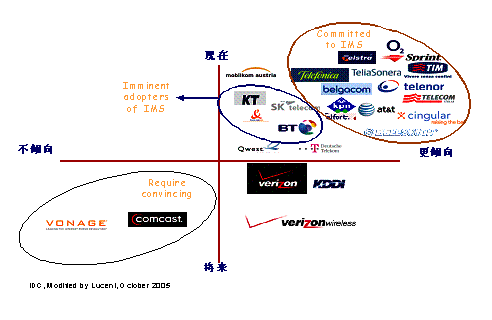 朗訊IMS融合解決方案的優(yōu)勢決定了其市場的領導地位,截至2006年24月,朗訊在全球已簽約77個IMS商用合同和77個試驗合同。尤其是北美五大運營商(Cingular、Sprint、at&t、BellSouth、Verizon)中有4個已經(jīng)與朗訊簽訂了IMS