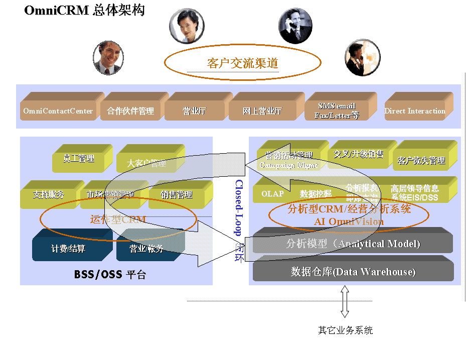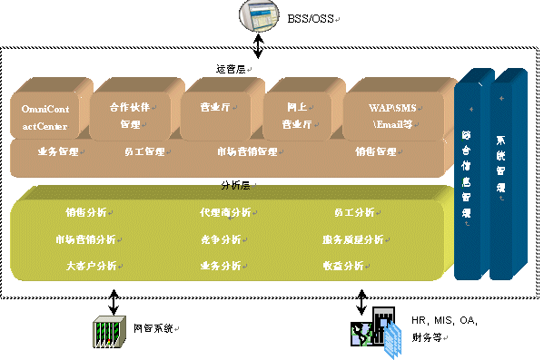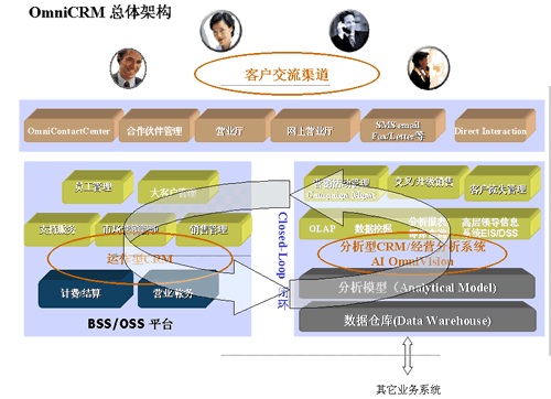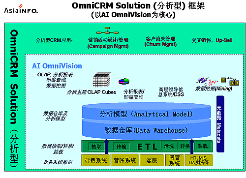 OmniCRM方案是亞信基于多年服務(wù)電信市場的豐富的行業(yè)經(jīng)驗(yàn),以及對(duì)國內(nèi)運(yùn)營商業(yè)務(wù)發(fā)展的深刻認(rèn)識(shí)而推出的,其中,AI OmniVision是OmniCRM方案中經(jīng)營分析型CRM 的核心產(chǎn)品。AI OmniVision不僅符合行業(yè)業(yè)務(wù)規(guī)范,而且基于對(duì)客戶行為、競爭環(huán)境,商業(yè)獲利率以及其他參數(shù)的透徹分析,能夠使運(yùn)營商充分了解現(xiàn)有客戶、識(shí)別并關(guān)注贏利的客戶組、提高服務(wù)質(zhì)量、確?蛻魸M意度和忠誠度;同時(shí)吸引潛在的客戶;加強(qiáng)提供新服務(wù)的投資回報(bào)率;提高效率、減小成本,以實(shí)現(xiàn)業(yè)務(wù)價(jià)值的最大化。AI OmniVision采用數(shù)據(jù)倉庫、ETL、OLAP分析、靈活報(bào)表展現(xiàn)及數(shù)據(jù)挖掘等技術(shù),包含了用戶分析、業(yè)務(wù)分析、收益分析、大客戶分析、營銷分析、競爭分析、服務(wù)質(zhì)量、新業(yè)務(wù)分析等眾多功能模塊。