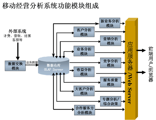 根據(jù)中國移動(dòng)的業(yè)務(wù)特征,AI OmniVision分為用戶分析、業(yè)務(wù)分析、收益分析、大客戶分析、營銷分析、競爭分析、服務(wù)質(zhì)量分析和綜合決策分析。同時(shí)在系統(tǒng)中還需要一些輔助模塊,以保證系統(tǒng)正常順利地運(yùn)行。這些輔助模塊包括: