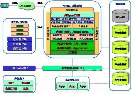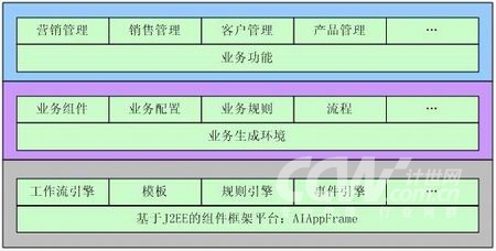 從總體上看AIOpenCRM定位為一個業(yè)務生成平臺,它分為三個部分,一個基于各種中間件(AIAppFrame、WorkFolw、BusinessRule等)實現(xiàn)的業(yè)務生成環(huán)境,第二個是基于業(yè)務邏輯數(shù)據(jù)模型實現(xiàn)的業(yè)務對象,最后是基于業(yè)務生成環(huán)境以及業(yè)務對象實現(xiàn)的業(yè)務功能。它們都是基于J2EE技術進行實現(xiàn)的。如下圖所示: