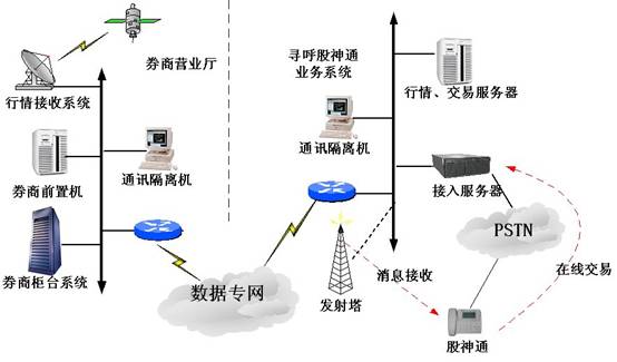 最終我們的設想是類似于呼叫中心的外包方式,由尋呼臺建立一套短訊接入系統(tǒng),并與券商的交易系統(tǒng)聯(lián)網(wǎng)(通過交易前置機),各券商租用部分資源,同時給他們的股民提供股神通話機,股民們一方面可通過尋呼臺的無線資源接收股市信息,另一方面可以通過電話線接入尋呼的交易系統(tǒng)進行交易。