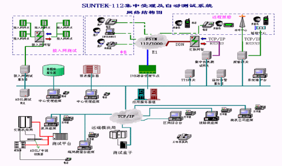 系統(tǒng)在設(shè)計(jì)時(shí)采用集中受理、分布測(cè)量的結(jié)構(gòu)化、模塊化設(shè)計(jì):受理中心進(jìn)行112的集中受理和業(yè)務(wù)處理,端局完成相應(yīng)用戶(hù)線(xiàn)的測(cè)試功能,所有測(cè)試數(shù)據(jù)等均送至受理中心。系統(tǒng)測(cè)試準(zhǔn)確、任務(wù)分擔(dān)、負(fù)荷均衡,處理速度快,性能可靠。系統(tǒng)的受理模塊和測(cè)試模塊相互協(xié)調(diào)又各自獨(dú)立,使二者可以統(tǒng)一地作為SUNTEKTM-112集中受理及自動(dòng)測(cè)試系統(tǒng),又能各自作為子系統(tǒng)與其它廠(chǎng)家(112系統(tǒng)、97系統(tǒng)、1000號(hào)等)的產(chǎn)品結(jié)合起來(lái)為112系統(tǒng)服務(wù)。系統(tǒng)網(wǎng)絡(luò)結(jié)構(gòu)圖如下所示: