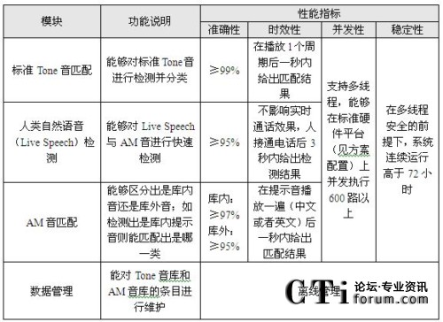 圖中,Tone音匹配采用模式匹配方法,可以實(shí)現(xiàn)對(duì)振鈴音,忙音,空號(hào),不可達(dá)音等100多種標(biāo)準(zhǔn)提示音的識(shí)別。AM(Answering Machine)音匹配主要負(fù)責(zé)識(shí)別傳真機(jī)、自動(dòng)答錄機(jī)等機(jī)器語音,同樣采用模式匹配方法,將收到的語音與標(biāo)準(zhǔn)樣本庫(kù)進(jìn)行比對(duì)。人類自然語音檢測(cè)的功能主要通過人真實(shí)聲音的檢測(cè),來判斷是否需要進(jìn)行語音匹配。