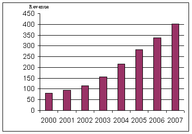 圖1表明了2000年至2007年亞太新一代移動(dòng)網(wǎng)絡(luò)市場(chǎng)的收入與增長(zhǎng)。