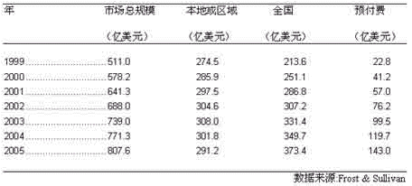 本地或區(qū)域價格方案在我們預(yù)測的時期內(nèi), 將始終是手機用戶采納的最多的一種方案。 1999年,在美國有5千7百 萬,大約70%的用戶是采用本地或區(qū)域方案, 而該方案產(chǎn)生的營業(yè)額為274.5億美元, 約占市場總規(guī)模的58.6%。Frost & Sullivan 預(yù)計,到2005年, 46.6%的手機用戶還會使用該種方案, 而該方案產(chǎn)生的營業(yè)額將為291.2億美元,占市場總規(guī)模的比例將縮至36.1%。