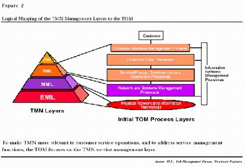 國際電聯(lián)的出發(fā)點雖好,但它更強調(diào)從網(wǎng)絡元素層開始的清晰的統(tǒng)一體系,而為了保護自己的商業(yè)秘密,各大運營商往往不希望公開自己的網(wǎng)絡元素層的標準,同時,網(wǎng)絡元素層的標準化對運營商的業(yè)務發(fā)展幫助不大。在熱烈討論了一段時間之后,TMN漸漸被忽視了。而另一只希望從技術角度解決管理問題的力量,電信管理論壇,卻帶有一定偶然性地逐漸確立了自己的地位。電信管理論壇在開始的時候并沒有夢想能建立覆蓋整個電信運營企業(yè)的管理系統(tǒng),其初衷是解決在當時日漸突出的跨企業(yè)的客戶數(shù)據(jù)交換問題。因此,和國際電聯(lián)不同,電信管理論壇從開始就非常強調(diào)實用性,并把目光集中到了各企業(yè)相互間有大量數(shù)據(jù)交換,因此迫切需要建立標準的服務管理層和網(wǎng)絡管理層,并提出了電信運營支持系統(tǒng)(OSS)的概念,并公布了模塊化的電信運營導圖(TOM)。