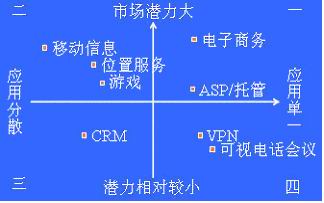 。〉谌笙蓿菏袌鰸摿Ρ容^小,應用比較分散。由于經(jīng)營靈活,貼近客戶,小服務提供商在此會有非常大的優(yōu)勢。大型運營商如想經(jīng)營此象限內(nèi)的業(yè)務,必須努力減小不同用戶需求的差異,并造成成本領先。如客戶關系管理(CRM)。