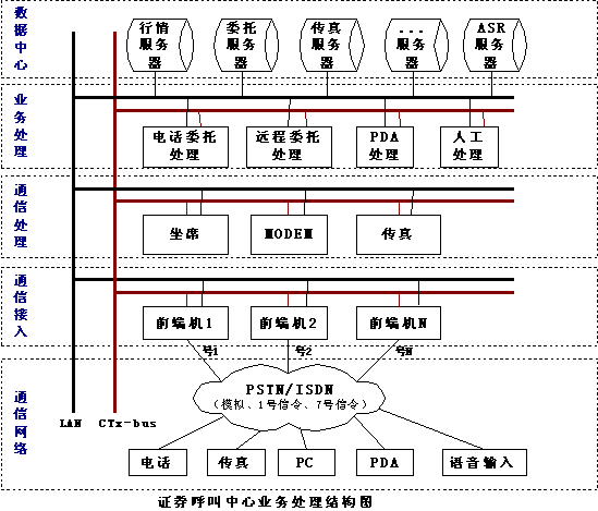另一種方案是PDA和證券營業(yè)部前端機(實際就是電話委托前端機)采用FSK通訊方式,使用電話委托的通道來完成所有的委托查詢。這種方式的速度快,信息容量大,保密性強,而且營業(yè)部不需單獨申請電話線路,PDA和電話委托線路可動態(tài)分配,使其電話線路得到最大限度的利用。另外,營業(yè)部對外形象也好,只用一個號碼就可讓股民完成電話委托、PDA委托等多種委托方式,給股民帶來了方便。不過這種方式需要得到電話語音卡提供廠商的產品技術支持,語音卡必須同時支持標準的DTMF和FSK的方式,卡上有充足的能力來處理兩種方式,在語音處理卡的底層驅動應該將電話和PDA的委托區(qū)別開來,目前市場能夠完全支持這種應用的只有深圳市東進通訊技術股份有限公司的產品,東進技術的新一代PCI系列語音卡數(shù)字卡和模擬卡都完全采用DSP(數(shù)字信號處理器)架構,卡上有專用DSP來處理DTMF和FSK的收發(fā),是目前PDA委托前端的最好選擇;這種方案還應該得到證券電話委托系統(tǒng)的開發(fā)商的支持,在電話委托系統(tǒng)里增加處理PDA委托的功能。目前恒基偉業(yè)的“股靈通”就是采用這種方式。