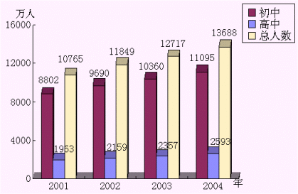 2001年,中國大陸中學學生人數(shù)已達10765萬人,而且學生人數(shù)還在快速增長。初中學生人數(shù)以每年6.5%的速度增長,普通高中學生人數(shù)也以每年10%-11%的速度增長?梢钥闯,教育市場巨大的潛力和商機。