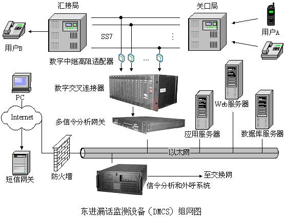 東進(jìn)漏話(huà)監(jiān)測(cè)設(shè)備(DMCS)采用大容量、高穩(wěn)定的電信級(jí)的基礎(chǔ)平臺(tái),其中數(shù)字交叉連接器和多信令分析網(wǎng)關(guān),都采用標(biāo)準(zhǔn)的19英寸機(jī)架設(shè)計(jì),便于客戶(hù)的安裝和使用,設(shè)備單平臺(tái)最大可同時(shí)接入64個(gè)E1,平臺(tái)利用東進(jìn)公司核心的信令采集技術(shù)、語(yǔ)音媒體處理和交換技術(shù),提供全程中國(guó)七號(hào)信令,支持ISUP信令方式,具有較穩(wěn)定的信令可靠性和接續(xù)速度。平臺(tái)采用與短信網(wǎng)關(guān)連接的解決方案,支持與SMC和SMG兩種連接方式。