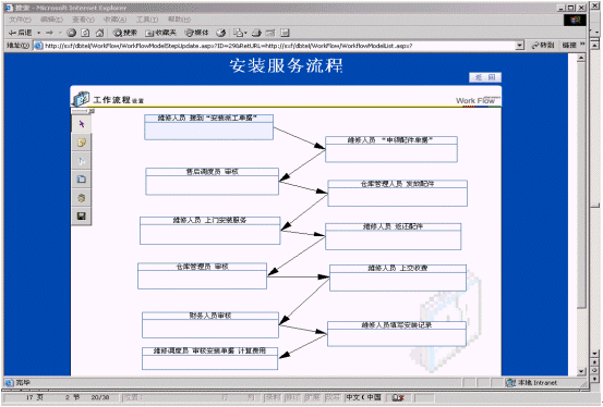工作流程是指企業(yè)或公司的某種工作按照特定規(guī)范的流程在計算機(jī)上實現(xiàn)流轉(zhuǎn)的過程,工作流程由步驟、行為、行為處理、崗位的設(shè)置、權(quán)限設(shè)置等基本元素組成,主要對維修和回訪的流程進(jìn)行管理。