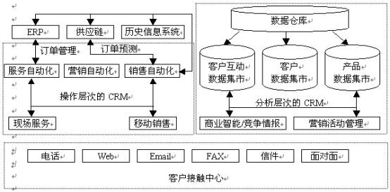 正如圖1所示,現(xiàn)在一般認(rèn)為,目前的CRM產(chǎn)品分為這樣基本的三類(lèi):分析型CRM(圖中的分析層次的CRM)、運(yùn)營(yíng)型CRM(圖中的操作層次的CRM)和交互型CRM(圖中的客戶(hù)接觸中心)。交互型CRM主要在于建立一個(gè)企業(yè)與用戶(hù)的交互、溝通渠道,如電話(huà)、傳真、Web、Email、短消息、面對(duì)面接觸;運(yùn)營(yíng)型CRM主要在于運(yùn)行企業(yè)的市場(chǎng)營(yíng)銷(xiāo)、銷(xiāo)售和服務(wù)的自動(dòng)化應(yīng)用,記錄客戶(hù)的基本信息和互動(dòng)信息;而分析型CRM則在于分析完整客戶(hù)信息(包括靜態(tài)的客戶(hù)基本信息和動(dòng)態(tài)的客戶(hù)交互信息),掌握和預(yù)測(cè)客戶(hù)的個(gè)性化需求,并開(kāi)展相應(yīng)的營(yíng)銷(xiāo)和銷(xiāo)售活動(dòng),提供相應(yīng)的服務(wù)和支持。