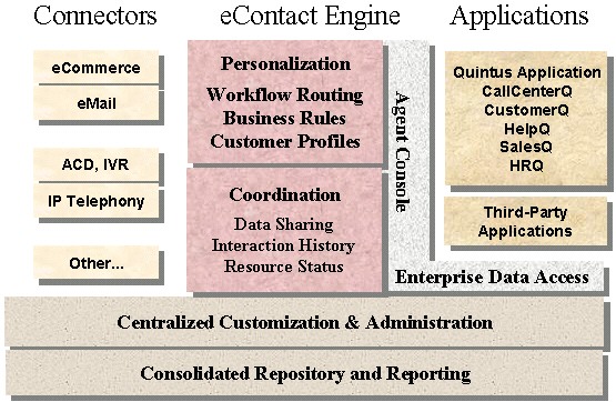 Quintus最新推出的Quintus eContact Suit 5.6是一套完整全面的CRM解決方案,包括交互層次的CRM——客戶(hù)接觸中心,運(yùn)營(yíng)層次的CRM——Quintus CRM應(yīng)用(如CallCenterQ、SalesQ等)和分析層次的CRM——Quintus報(bào)表分析系統(tǒng)