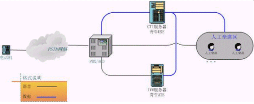 上圖是客服中心較常見的結(jié)構(gòu)圖,相當(dāng)于將初級客服的CT-Server服務(wù)器一分為三。原來的語音板卡由現(xiàn)在真正的PBX替代,青牛USE和青牛ATS則是從CT-Server軟件包中獨(dú)立出來,強(qiáng)化各自的核心功能,運(yùn)行在兩臺單獨(dú)的服務(wù)器上(IVR服務(wù)器還是需要語音板卡來處理話路,但語音板卡已經(jīng)不負(fù)責(zé)PBX的交換功能了)。這種類型的客服中心可以給客戶更大規(guī)模的、更穩(wěn)定的服務(wù),并且撥入電話的客戶感覺不到系統(tǒng)的變化。