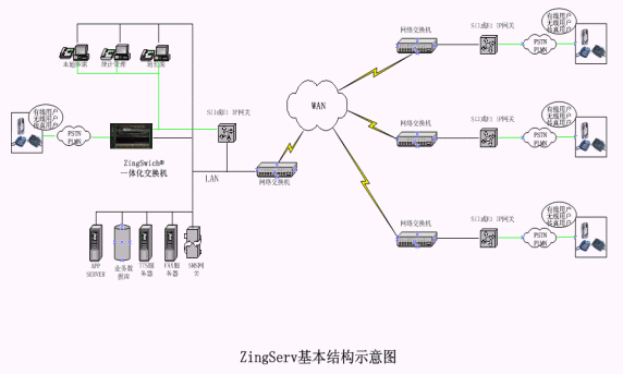 硬件:各點(diǎn)都有ZingSwitch®,S口網(wǎng)關(guān)和CO8卡或E1 接口網(wǎng)關(guān)和E1卡。