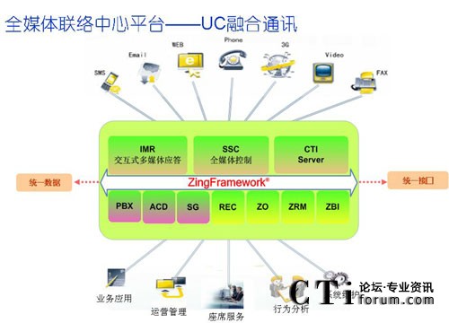 英立訊公司ZingFramework®®全媒體聯(lián)絡(luò)中心平臺基于H.323和SIP等國際標(biāo)準(zhǔn)協(xié)議,通過SOA服務(wù)架構(gòu)實現(xiàn)聯(lián)絡(luò)中心的優(yōu)化計算,為客戶應(yīng)用提供了多媒體服務(wù)處理能力,支持固話、手機、傳真、郵件、短信、互聯(lián)網(wǎng)和Web電話等多種通信方式的接入,以及3G視頻互動和RFID物聯(lián)應(yīng)用,實現(xiàn)多種服務(wù)媒體和通訊渠道的統(tǒng)一融合,并提供統(tǒng)一接入、統(tǒng)一路由、統(tǒng)一排隊、統(tǒng)一服務(wù)、統(tǒng)一處理和回復(fù)的的綜合融合通訊服務(wù)平臺。
