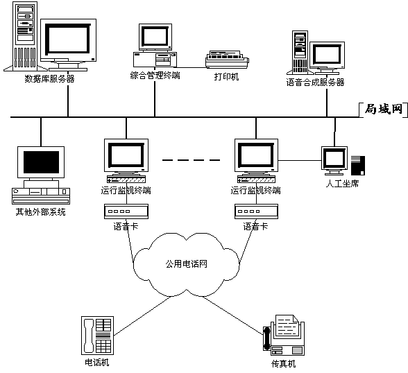 管理終端通道設置、業(yè)務內(nèi)容設置、操作人員管理,打印各種報表、報警數(shù)據(jù)。上面安裝綜合管理子系統(tǒng),操作系統(tǒng)為Windows 95/98/2000。
