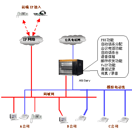 | 多個小型辦公室共享一個電話系統(tǒng)或局域網是一個比較經濟選擇,現(xiàn)在很多辦公樓也是采用這種方式為大樓里的辦公室提供通訊或數(shù)據服務,大大減少了租戶的通訊的投資。但是采用傳統(tǒng)的交換機也帶來很多不便。如只能有一個總機,撥入的電話不知道是找哪個公司的,既增加接線員的工作,又不利樹立公司的形象。如何公平地向共用交換機的辦公室的收取電話費也是個解決不了的問題,因為無法記錄和統(tǒng)計每個辦公室的撥出的電話量。 但是采用奧迪堅的ALTISERV,這些問題很自然地就解決了。將每個辦公室設成一個工作組,每個工作組可以設置特定的撥入撥出電話市話號碼,對總機而言,來電時的桌面顯示公司名,或者通過多個自動話務臺直接轉入工作組。 對于撥出電話,只能通過事先設定電話進入市話網。這樣,這個電話的全部費用都由這個公司。 此外,共享的辦公室及其員工都可以使用ALTISERV提供的全部功能,就好象這個辦公室建了一個專門的網絡電話系統(tǒng)一樣。 接線圖如下: |