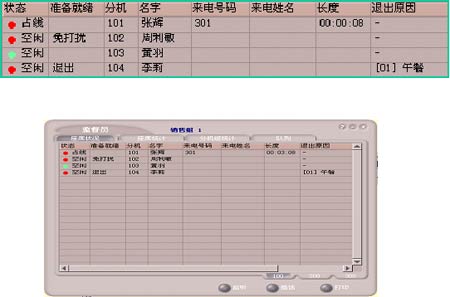 班長席子系統(tǒng)除了話務(wù)席子系統(tǒng)中所介紹的全部功能外,還具有監(jiān)聽、錄音、強(qiáng)拆電話、攔截呼叫、話務(wù)席監(jiān)控、話務(wù)工作量統(tǒng)計等座席管理功能。