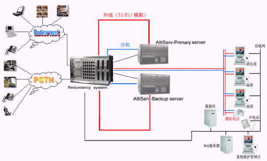 奧迪堅(jiān)通訊系統(tǒng)有限公司作為CTI通訊平臺(tái)的提供商,在技術(shù)上不斷創(chuàng)新,對(duì)產(chǎn)品精益求精,尤其體現(xiàn)在對(duì)系統(tǒng)的運(yùn)行安全性的要求上,為了防止電信接入設(shè)備或者企業(yè)網(wǎng)絡(luò)出現(xiàn)故障而造成的呼叫中心服務(wù)中斷,奧迪堅(jiān)呼叫中心系統(tǒng)提供安全保護(hù)冗余切換系統(tǒng),來(lái)保障呼叫中心在意外情況下的正常工作,該安全冗余切換系統(tǒng)通過(guò)對(duì)電源、T1/E1、模擬trunk、分機(jī)座席、以及各種網(wǎng)絡(luò)鏈路串口等備份切換來(lái)實(shí)現(xiàn)可靠的運(yùn)行。除此之外,奧迪堅(jiān)系統(tǒng)本身也提供強(qiáng)大的安全保障,由于采用先進(jìn)IP內(nèi)核一體化設(shè)計(jì),集傳統(tǒng)PBX、CTI服務(wù)器、IVR、ACD、Recording、FAX等眾多設(shè)備于一體,這樣有效的避免了因?yàn)橥鈷煸O(shè)備過(guò)多以及設(shè)備供應(yīng)商的不同而存在的兼容性的問(wèn)題,從而降低了給呼叫中心系統(tǒng)帶來(lái)的的不穩(wěn)定的安全隱患。在系統(tǒng)之外依靠安全保護(hù)冗余切換系統(tǒng),可以實(shí)現(xiàn)外線、分機(jī)、以及各種鏈路接口的雙倍安全運(yùn)行。如上圖所示:兩臺(tái)奧迪堅(jiān)的呼叫中心服務(wù)器和奧迪堅(jiān)安全冗余切換系統(tǒng)構(gòu)成呼叫中心熱備份系統(tǒng),在兩臺(tái)服務(wù)器中安裝所有的呼叫中心功能模塊。通常情況下由主呼叫中心服務(wù)器提供系統(tǒng)的正常運(yùn)行,備份服務(wù)器通過(guò)安全保護(hù)冗余切換系統(tǒng)的服務(wù)監(jiān)測(cè)模塊來(lái)監(jiān)測(cè)主服務(wù)器的各項(xiàng)設(shè)備和鏈路的使用情況,當(dāng)主服務(wù)器遭遇突發(fā)故障不能繼續(xù)工作時(shí),系統(tǒng)馬上實(shí)施自動(dòng)切換,就會(huì)通過(guò)安全保護(hù)冗余切換系統(tǒng)將系統(tǒng)切換到備份的呼叫中心系統(tǒng)上來(lái),此鏈路可以是數(shù)據(jù)、語(yǔ)音、網(wǎng)絡(luò)、串口等。當(dāng)安全保護(hù)冗余切換系統(tǒng)自身出現(xiàn)斷電或者其他故障時(shí),所有鏈路均保持正常工作狀態(tài)。