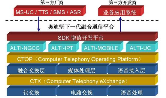 下一代融合通信平臺架構CTOP(Computer Telephony Operation Platform)包含了融合交換層、媒體處理層和語音接入層,與傳統(tǒng)通信平臺架構的區(qū)別之處在于:其融合交換層不僅僅包含IP-PBX功能,還包含ACD、CTI、IVR、CDR、Voice