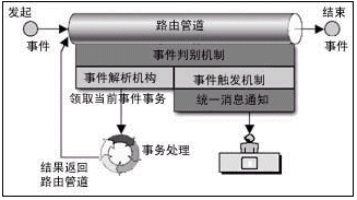 在路由管道中流轉(zhuǎn)著加載了業(yè)務(wù)的工作流事件。事件按照事先定義的路由規(guī)則流轉(zhuǎn),事件的路由規(guī)則定義了事件在路由管道中可以停靠的“站臺(tái)”,同時(shí)定義了事件到達(dá)“站臺(tái)”時(shí)可以領(lǐng)取并處理加載在事件上的業(yè)務(wù)的角色。事件從始發(fā)站臺(tái)進(jìn)入路由管道,經(jīng)過一個(gè)或多個(gè)中間站臺(tái),最后到達(dá)終點(diǎn)站。事件每?恳粋(gè)站臺(tái),相關(guān)人員領(lǐng)取事務(wù),并進(jìn)行處理后重新裝載事務(wù),觸發(fā)事件向下一個(gè)站臺(tái)流轉(zhuǎn),除非事件已經(jīng)到達(dá)終點(diǎn)站。