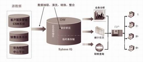 利用Sybase IQ的產(chǎn)品優(yōu)勢(shì),我們將客戶服務(wù)管理系統(tǒng)、銷售業(yè)務(wù)系統(tǒng)、華為呼叫中心平臺(tái)的各種異構(gòu)數(shù)據(jù)庫(kù)數(shù)據(jù),通過(guò) IQ 提供的直接數(shù)據(jù)訪問(wèn)方式,逐步實(shí)施對(duì)數(shù)據(jù)的抽取、轉(zhuǎn)換及加載(ETL),最終整合到