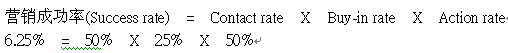 rate(接觸率,能夠聯(lián)系到客戶的比率), Buy-in rate(接受率,聯(lián)系到的客戶里面表達有興趣的比率), Action rate(成交率,表達有興趣的客戶里面真正付錢購買的比率)。一般而言,接觸率能達到50%算是不錯的名單,而接受率能達到25%算是產(chǎn)品、名單選擇登對,銷售技巧也到位,最后臨門一腳的成交率應(yīng)該要能到50%算是達標了。以下列公式來表達(標準以上述的比率套用):