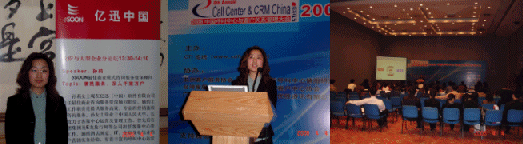一年一度的中國呼叫中心與客戶關(guān)系管理大會(huì)于2006年4月3日在北京國際會(huì)議中心隆重開幕,并與4月5日?qǐng)A滿閉幕。今年大會(huì)主題為:新時(shí)期的呼叫中心及CRM,成就與挑戰(zhàn)。此次活動(dòng)吸引了與呼叫中心相關(guān)的各界人士的光臨,共計(jì)1000多人與會(huì),活動(dòng)連續(xù)三天。億迅(中國)軟件有限公司(eSOON)作為呼叫中心及CRM業(yè)優(yōu)秀的開發(fā)商和集成商,在本次大會(huì)上以特別贊助商的身份閃亮登場(chǎng),給大家留下了深刻的印象,并為大家?guī)砗艚兄行募癈RM領(lǐng)域最新的趨勢(shì)分析及最佳的解決方案。