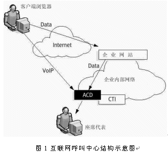 互聯網呼叫中心是在互聯網技術飛速發(fā)展的基礎上所產生的。對于客戶而言,完全的互聯網呼叫中心和傳統呼叫中心最大的區(qū)別就在于客戶無需電話,只要從一個Web站點就可以直接進入互聯網呼叫中心。這樣一來,呼叫中心就從傳統形式上的“撥號-交談(Dial to Talk)”發(fā)展到現代形式的“點擊-交談(Click to Talk)”。典型的互聯網呼叫中心結構如圖1所示。