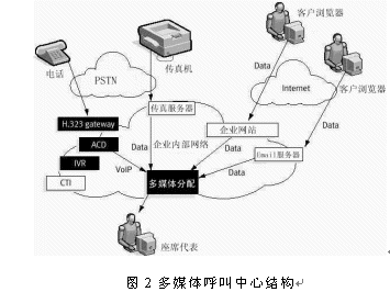 多媒體呼叫中心實際上是基于CTI技術的傳統呼叫中心和互聯網呼叫中心的相互結合,其接入手段不但有傳統的電話、而且包括了傳真接入、Email接入、Web接入和IP電話接入等。典型的多媒體呼叫中心結構如圖2所示。