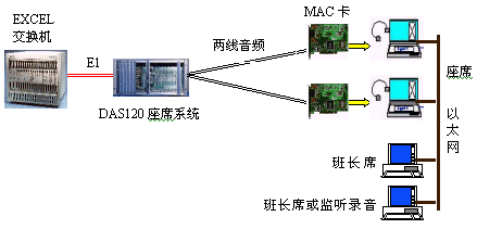 因?yàn)镋XCEL交換機(jī)不能提供模擬接口。DAS120的出現(xiàn)很好地彌補(bǔ)了其不足。它與EXCEL交換機(jī)采用4個(gè)E1連接,可以簡潔實(shí)現(xiàn)PCM信號轉(zhuǎn)模擬信號引出到座席。E1接口的信令可選配為隨路信令CAS和透明通道Clear
