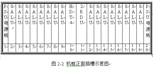 見(jiàn)圖 2 和 3 ,遠(yuǎn)端模塊采用 19 英寸標(biāo)準(zhǔn)機(jī)框,高度為 5U ,可安裝在各種標(biāo)準(zhǔn)的 19 英寸的機(jī)柜中。機(jī)框共 20 個(gè)插槽,正面插板,反面背板出線(xiàn)。每個(gè)機(jī)框可插 20 塊各種類(lèi)型的板件,其中兩邊第 1 第 20 槽固定插電源板 PSU ,中間第 10 號(hào)槽固定插數(shù)字中繼接口板 HDT4 ,其余 16 個(gè)槽為通用槽口,可插 16 塊各種類(lèi)型接口板。每塊板為 8 路,一個(gè)機(jī)框總共 128 話(huà)路。調(diào)度接口板 2RDU 固定插第 11 槽,該板不占機(jī)框端口。對(duì)于自帶交換系統(tǒng),需要安裝一塊系統(tǒng)信號(hào)音板 8TDU ,該板固定插 19 槽,占 8 個(gè)端口。