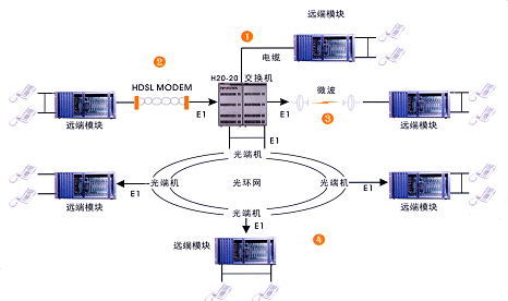 遠(yuǎn)端模塊通過(guò)標(biāo)準(zhǔn) 2M ( E1 )接口與交換機(jī)連接。該接口不受傳輸距離和傳輸設(shè)備的限制。常用的傳輸設(shè)備有 SDH 、 PDH 光端機(jī)(光纜),數(shù)字微波、數(shù)字?jǐn)U頻, HDSL 調(diào)制解調(diào)器(雙絞線(xiàn))等。
