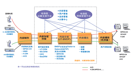 - 完整的解決方案,從內(nèi)容編碼、轉(zhuǎn)碼、分發(fā)、計費、用戶管理、EPG、NMS、媒體資產(chǎn)管理、運營支撐系統(tǒng)、安全性、DRM及機頂盒等;