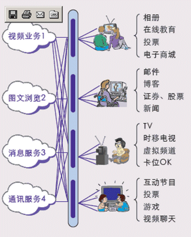 - 豐富多彩的互動增值業(yè)務(wù): 可視電話、電視短信、電視競猜、電視投票、游戲、信息瀏覽等
