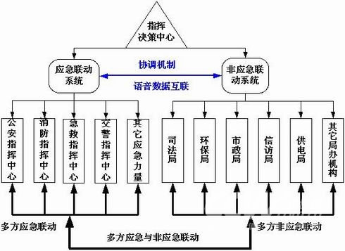 應急與非應急一體化聯動的組織體系如下圖所示。其中,應急聯動中心通過對公安、消防、急救、交警、其它應急或救援力量、專業(yè)救災機構的指揮和調度,實現多方應急聯動。非應急聯動中心通過對司法局、環(huán)保局、市政局、信訪局等政府部門以及供電局、自來水公司等城市公共事業(yè)機構、單位的指派和監(jiān)督,實現多方非應急聯動。應急聯動中心和非應急聯動中心均接受指揮決策中心的統(tǒng)一領導和集中指揮, 并通過其相互協調機制實現多方的應急力量與非應急部門的一體化聯動。