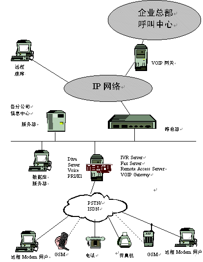 隨著信息技術(shù)的發(fā)展,企業(yè)對通訊的需求越來越多,并越來越呈現(xiàn)多樣性,有語音通訊,傳真通訊,數(shù)據(jù)通訊等。我們拿銀行作為一個例子來分析,目前我國大多數(shù)大型商業(yè)銀行都在各個市(甚至縣)建有一個IVR交互式語音應(yīng)答系統(tǒng)以滿足其客戶的語音查詢需求;同時,系統(tǒng)也要具備傳真通訊功能,以滿足某些大客戶需要傳真回復(fù)確認(rèn)的需求;目前,各個商業(yè)銀行也建立了自己的企業(yè)銀行平臺,所以中心也需構(gòu)建一個接入服務(wù)器來滿足某些大客戶的遠(yuǎn)程撥號接入進(jìn)行遠(yuǎn)程交易;隨著Call center 應(yīng)用的興起,各商業(yè)銀行的省行呼叫中心需要將其各市行的語音接入平臺(IVR),通過VoIP 技術(shù),接入到省行的Call Center 中心,從而建立一個分布式的Call Center,以提高對其客戶服務(wù)的滿意度 。