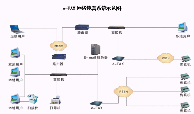 e-FAX網(wǎng)絡(luò)傳真機(jī) 的工作原理是利用內(nèi)部設(shè)備對(duì)傳真和語(yǔ)音信號(hào)的存儲(chǔ)及轉(zhuǎn)換功能,在網(wǎng)絡(luò)配置許可的范圍內(nèi) , 主要實(shí)現(xiàn)了自動(dòng)接收和發(fā)送傳真的功能。系統(tǒng)內(nèi)用戶能通過(guò)電子郵件和網(wǎng)頁(yè)方式收取自己的傳真或語(yǔ)音,發(fā)送傳真時(shí)只需要提交傳真給傳真服務(wù)器,服務(wù)器能自動(dòng)發(fā)送。系統(tǒng)外用戶能在語(yǔ)音流程的提示下發(fā)送或接收傳真,也可以選擇發(fā)送留言信息。系統(tǒng)管理員則可以對(duì)系統(tǒng)進(jìn)行參數(shù)配置,流程定制和用戶信息管理等功能操作。