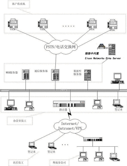 本系統(tǒng)采用最新的J2EE WEB技術(shù),在組成結(jié)構(gòu)上主要由以下三大模塊組成:1)WEB服務(wù)器: 完成用戶通過IE瀏覽器接入訪問, 傳真發(fā)送及接收的操作界面,傳真結(jié)果的查詢,客戶地址本的維護(hù)等工作;2)傳真發(fā)送/接收通信服務(wù)器:主要完成驅(qū)動(dòng)傳真板卡,通過通信線路收發(fā)傳真,檢測(cè)通信線路、對(duì)方狀態(tài),發(fā)送接收隊(duì)列管理等工作;3)數(shù)據(jù)庫(kù)服務(wù)器:主要負(fù)責(zé)用戶信息,用戶地址本信息,傳真記錄等信息存儲(chǔ)工作。